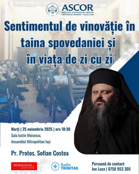 Între orele 18:30 și 20:30, Asociația Studenților Creștini Ortodocși Români – Filiala Iași organizează, în Sala „Iustin Moisescu” din cadrul Ansamblului Mitropolitan, conferința cu tema: „Sentimentul de vinovăție în taina spovedaniei și în viața de zi cu zi”, susținută de părintele protosinghel Sofian Costea. Evenimentul se adresează voluntarilor ASCOR Iași și studenților.