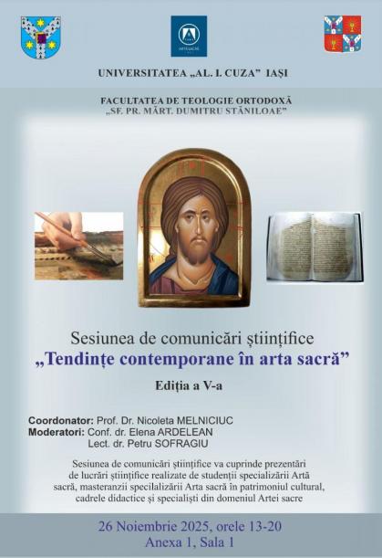 Astăzi, între orele 13:00 și 20:00, va avea loc Sesiunea de comunicări științifice „Tendințe contemporane în arta sacră”, ediția a V-a, organizată de Universitatea „Alexandru Ioan Cuza” din Iași, Facultatea de Teologie Ortodoxă „Sfântul Părinte Mărturisitor Dumitru Stăniloae”. Evenimentul se va desfășura în Anexa 1, Sala 1. Sesiunea este coordonată de Prof. Dr. Nicoleta Melniciuc, iar Conf. Dr. Elena Ardelean și Lect. Dr. Petru Sofragiu vor fi moderatori. În cadrul întâlnirii vor fi prezentate lucrări științifice realizate de studenți și masteranzi ai specializării Arta Sacră, precum și de cadre didactice și specialiști din domeniu, care vor aborda direcțiile actuale și cercetările recente din arta sacră.